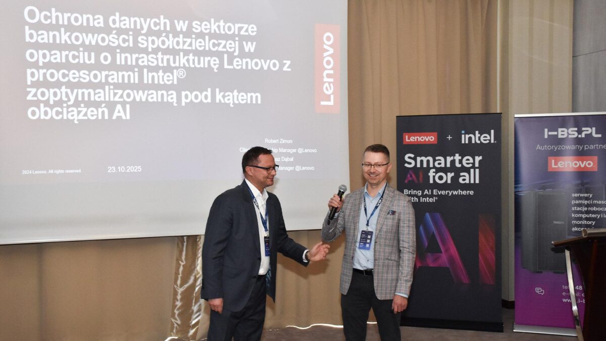 W części poświęconej infrastrukturze IT wystąpili przedstawiciele Lenovo Polska – Mariusz Dąbal, One Lenovo Partner Account Manager, oraz Robert Zimon, Client Relationship Manager. Eksperci zaprezentowali, jak serwery z procesorami Intel® wspierają bezpieczeństwo danych oraz stabilność systemów bankowych.